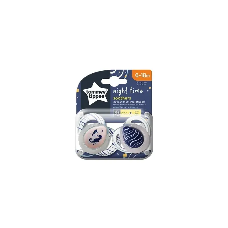 Le lot de 2 Sucettes Night Time de Tommee Tippee est spécialement conçu pour les bébés âgés de 6 à 18 mois afin de faciliter les nuits et les siestes. La caractéristique principale de cette sucette est son bouclier qui brille dans le noir (phosphorescent). Cela permet aux parents (et au bébé) de la retrouver facilement dans l'obscurité, sans avoir besoin d'allumer une lumière qui pourrait réveiller complètement l'enfant. En plus de cette fonction lumineuse, la sucette possède une tétine orthodontique symétrique qui soutient le développement oral naturel du bébé, et elle est fabriquée en silicone doux et souple.