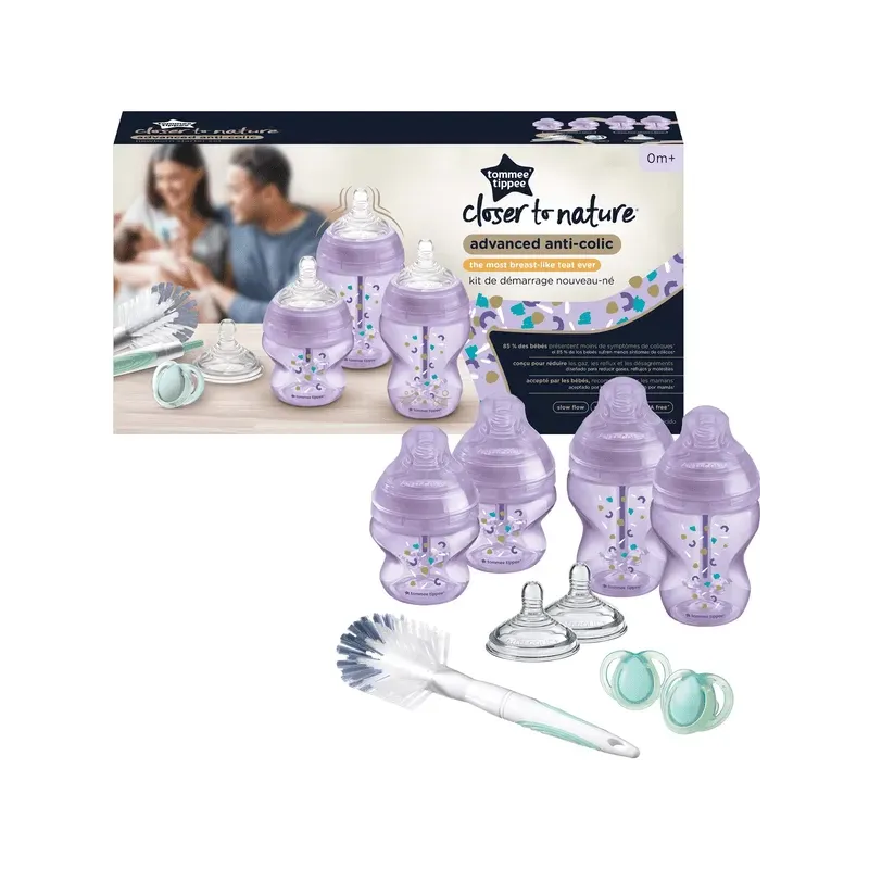 Kit de Naissance Advanced Anti-Colique Tommee Tippee rose, comprenant 4 biberons évolutifs, 2 tétines de rechange, 1 goupillon et 1 sucette, doté d'un système anti-colique avancé pour réduire les gaz et l'agitation du nouveau-né.