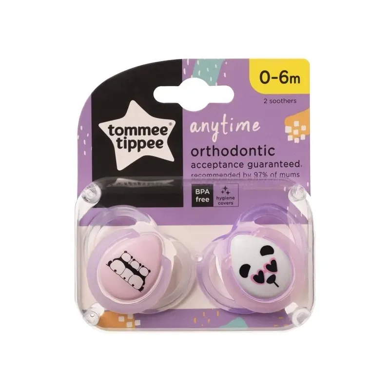 Lot de 2 sucettes Anytime Orthodontic 0-6M de Tommee Tippee, avec tétine symétrique en silicone, idéales pour l'apaisement quotidien et le soutien du développement oral du nouveau-né.