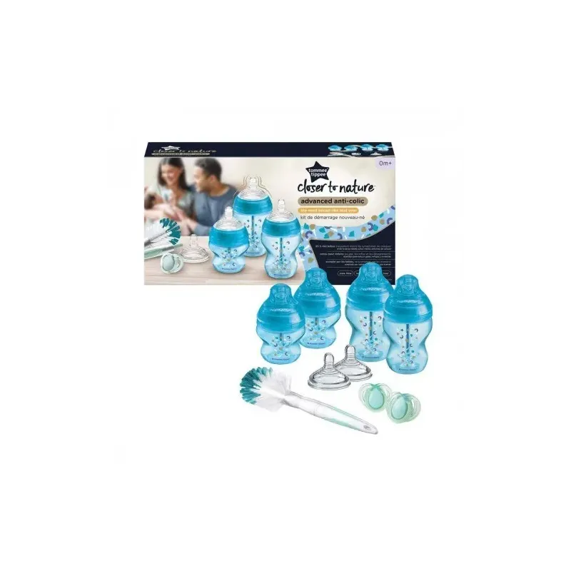 Kit de Naissance Advanced Anti-Colique Tommee Tippee bleu, contenant 4 biberons évolutifs (150 ml et 260 ml), 2 tétines de rechange (3M+), 1 goupillon et 1 sucette, avec un système anti-colique avancé pour réduire les gaz et l'inconfort du nouveau-né.
