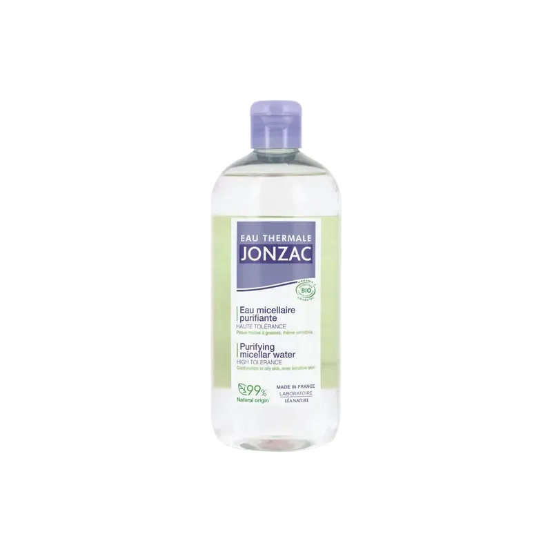 L'Eau Micellaire Purifiante Jonzac 500ml est un soin nettoyant et démaquillant quotidien spécifiquement conçu pour les peaux mixtes à grasses, même sensibles, et sujettes aux imperfections. Issue de la dermo-cosmétique bio, cette eau micellaire offre une solution tout-en-un pour purifier la peau en douceur, éliminer le maquillage (visage et yeux) et les impuretés, tout en aidant à réguler l'excès de sébum. Sa formule unique s'appuie sur l'Eau Thermale de Jonzac, reconnue pour ses propriétés apaisantes et régénérantes, combinée à des actifs purifiants qui respectent l'équilibre naturel de l'épiderme.