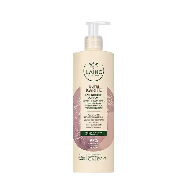 Le lait nutritif confort de LAINO est un soin corporel quotidien formulé pour nourrir, apaiser et protéger les peaux sèches et sensibles. Sa formule, composée à 97% d'ingrédients d'origine naturelle, est enrichie en beurre de karité, un ingrédient emblématique pour ses propriétés réparatrices et nutritives, et en huile de tournesol bio qui aide à maintenir l'hydratation de la peau. Ce lait onctueux pénètre rapidement sans laisser de film gras ou collant, apportant un confort immédiat et durable. Il aide à restaurer le film hydrolipidique de l'épiderme et à renforcer sa barrière naturelle contre les agressions extérieures, laissant la peau souple, douce et délicatement parfumée.