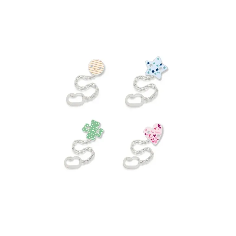 À une extrémité, un clip solide permet de fixer l'attache sucette aux vêtements de bébé, à une poussette, à un porte-bébé ou à un siège auto. Ce clip est conçu pour ne pas abîmer les tissus.