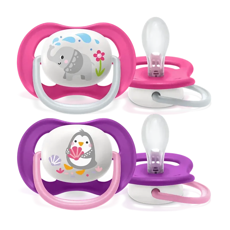 Lot de deux sucettes Philips Avent Ultra Air, conçues pour les bébés âgés de 6 à 18 mois. Cette référence est généralement associée à des motifs et couleurs pour filles, tels que l'éléphant et le pingouin, souvent dans des teintes de rose ou de violet. Elles sont conçues pour maximiser la respiration de la peau et soutenir le développement oral naturel.
