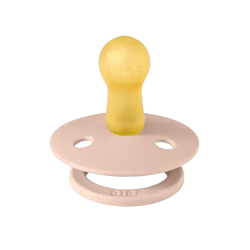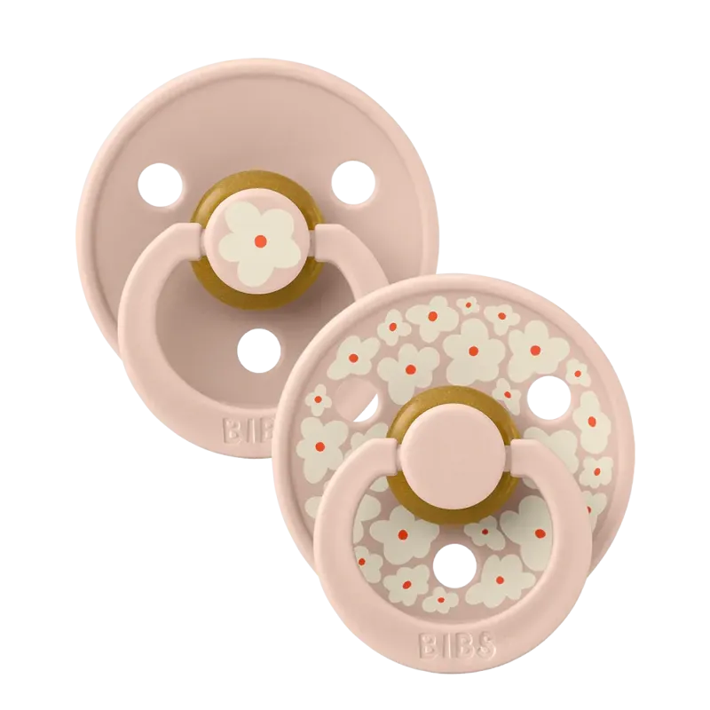 Lot de deux sucettes BIBS Colour Taille 1 en caoutchouc naturel (Jasmine et Blush), elles sont conçues pour les nouveau-nés et jeunes bébés, offrant une forme ronde apaisante qui imite le sein maternel et une collerette aérée pour un confort maximal et la prévention des irritations cutanées.