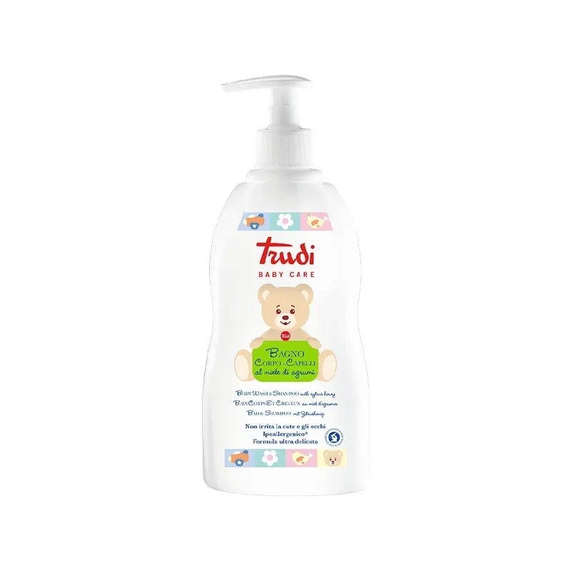 Le TRUDI BABY CARE GEL DOUCHE ET SHAMPOING est un produit de toilette 2-en-1, présenté en flacon familial de 500 ml, spécialement conçu pour nettoyer en douceur la peau et les cheveux délicats des bébés et des enfants. Sa formule est caractérisée par une base lavante extrêmement douce qui respecte l'équilibre naturel de la peau et du cuir chevelu. Il est idéal pour une utilisation quotidienne et complète, transformant le bain en un moment de soin agréable et sans larme.