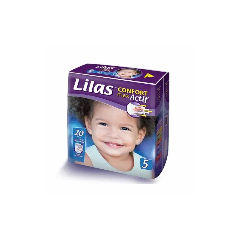 Couches bébé LILAS CONFORT MAX ACTIF Taille 6 (15-25 kg, paquet de 20), assurant une très haute absorption et une excellente liberté de mouvement pour les enfants actifs, avec un ajustement souple et sûr.