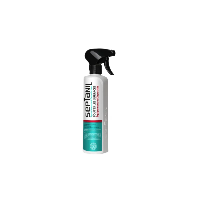 Description détaillée Le SEPTANIL DÉSINFECTANT MOUSSANT 500ML est une solution désinfectante professionnelle polyvalente, prête à l'emploi et présentée sous forme de mousse légère. Il est conçu pour le nettoyage et la désinfection simultanés des surfaces (sols, murs, plafonds, portes, ascenseurs) et des dispositifs médicaux non invasifs (plans de travail, paillasses, téléphones, fauteuils) dans les environnements exigeants. Sa texture moussante permet une meilleure adhérence sur les surfaces verticales et un nettoyage en profondeur. Ce produit est formulé pour être efficace contre un large éventail de micro-organismes, incluant les bactéries (Bactéricide), les champignons (Fongicide) et les virus (Virucide). Il est souvent légèrement parfumé (par exemple, mentholé ou floral, selon la version) pour laisser une sensation de fraîcheur. Il est un produit tout-en-un, simplifiant les protocoles d'hygiène.
