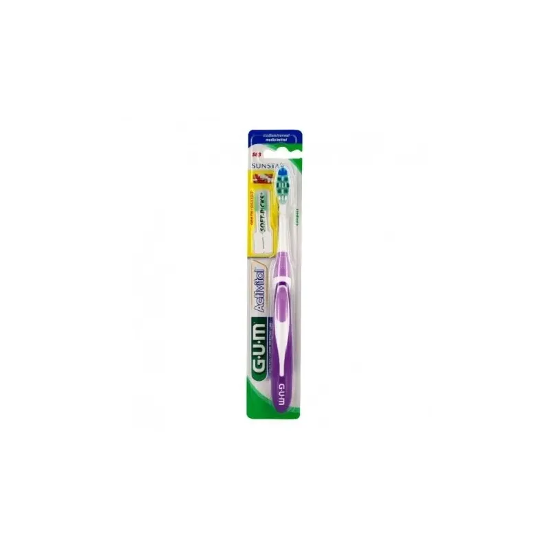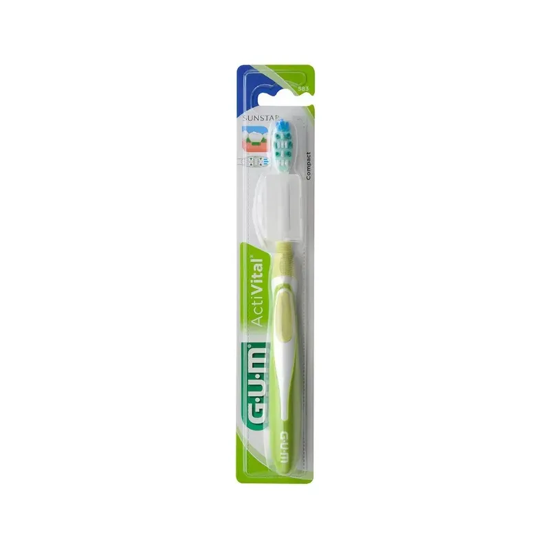 Brosse à dents GUM Activital Souple avec brins bi-niveaux pour un nettoyage profond des dents, une stimulation douce et un respect des gencives sensibles.