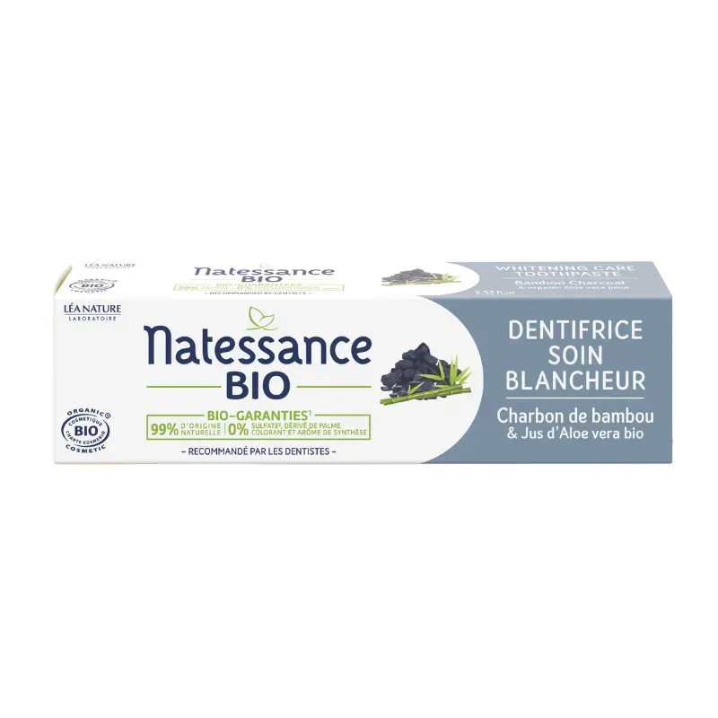 Dentifrice Natessance Soin Blancheur Bio 75ml, formule sans fluor à base de Charbon de Bambou et d'Aloe Vera Bio. Il aide à retrouver des dents plus blanches naturellement en respectant l'émail, tout en protégeant les gencives et en assurant une hygiène bucco-dentaire complète.