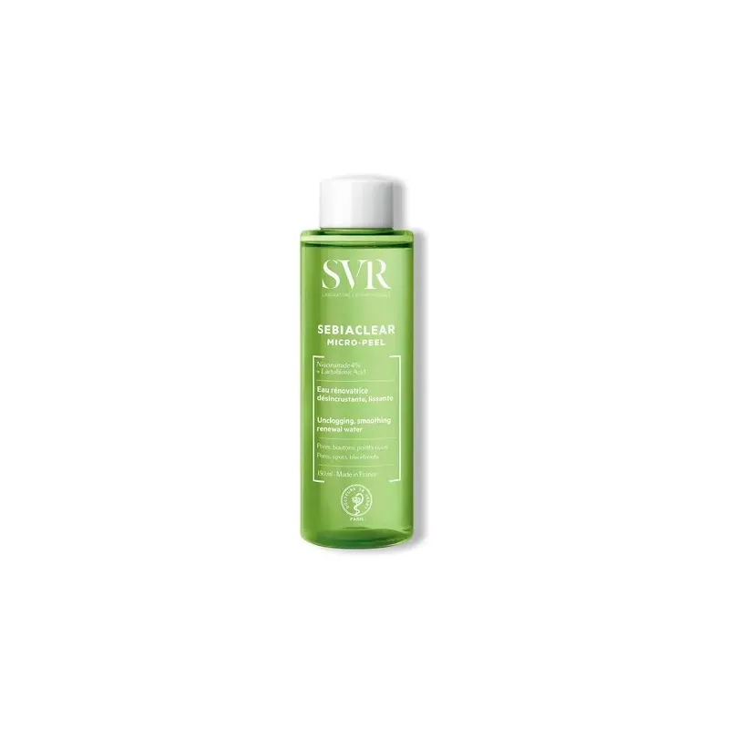 Le SEBIACLEAR MICRO PEEL de SVR est une eau concentrée, purifiante et lissante, spécialement formulée pour les peaux sensibles, grasses et à tendance acnéique. Ce soin quotidien, à la texture très légère, offre une double action : il désincruste les pores et affine le grain de peau tout en régulant l'excès de sébum. Sa formule est enrichie en gluconolactone, un actif kératolytique qui exfolie en douceur la surface de la peau, et en niacinamide (vitamine B3) qui apaise les inflammations et limite la prolifération bactérienne. En agissant sur les imperfections, il prévient leur apparition et réduit visiblement les marques résiduelles. Il laisse la peau nette, fraîche et purifiée, sans la dessécher.