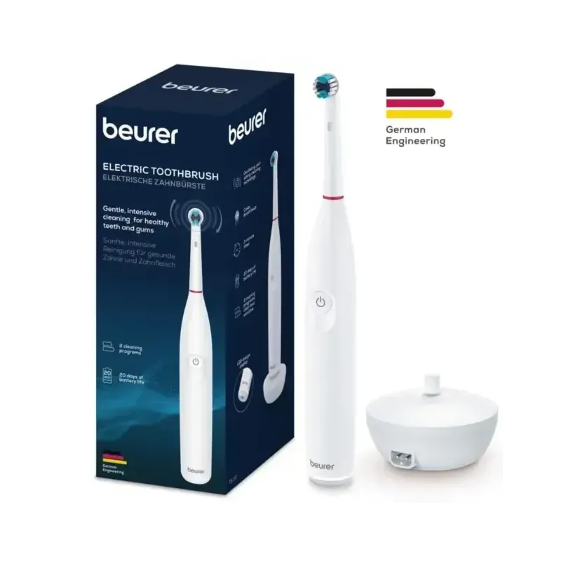 Brosse à dents électrique Beurer TB 30 à technologie sonique pour un nettoyage en profondeur. Elle est dotée d'une minuterie de 2 minutes, d'un indicateur de charge et est livrée avec deux brossettes de rechange.