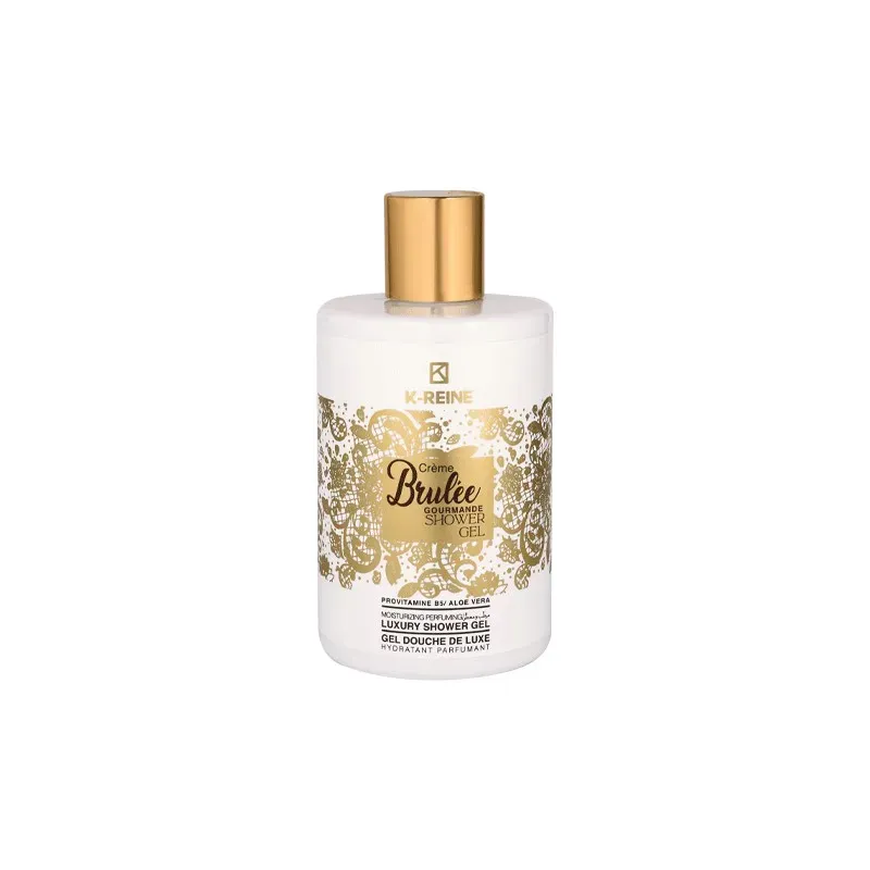 Gel douche K-REINE 300ML Crème Brûlée au parfum gourmand de vanille caramélisée, formule hydratante avec mousse abondante, nettoie en douceur et laisse la peau extra douce pour une sensation de bien-être de longue durée.