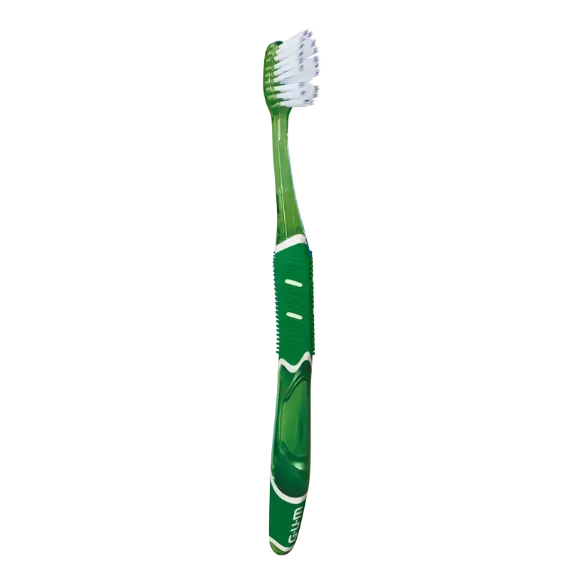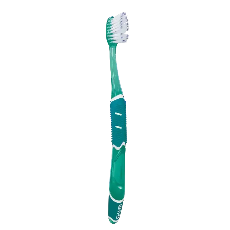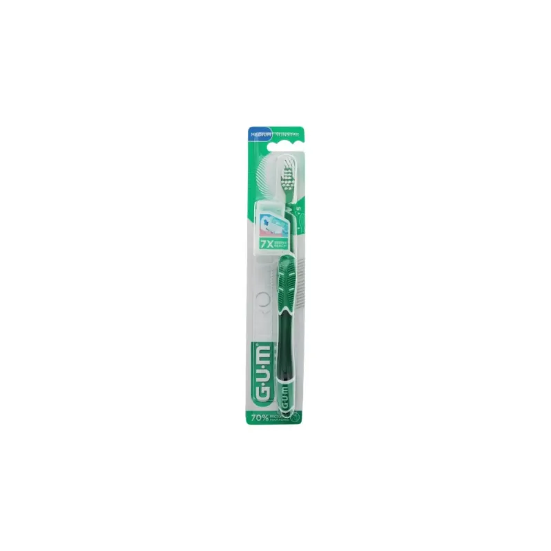 Brosse à dents GUM Technique Pro Medium, avec une tête compacte et inclinée, et des brins de dureté moyenne en forme de dôme pour un nettoyage en profondeur et précis des dents et du sillon gingival.