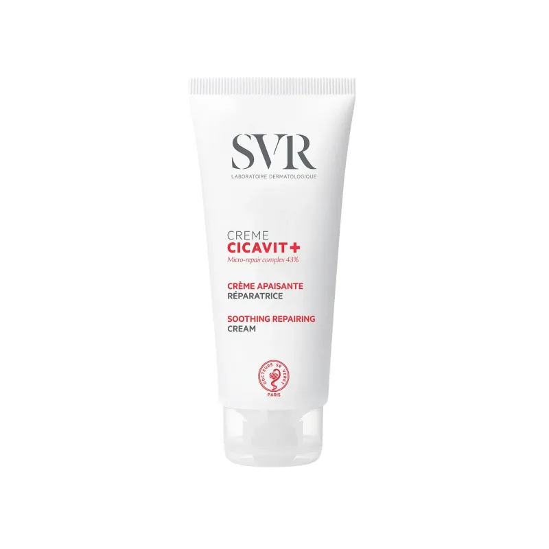 La crème apaisante CICAVIT+ de SVR est un soin réparateur qui accélère le processus de réparation cutanée et apaise intensément la peau fragilisée et irritée. Sa formule, enrichie en actifs cicatrisants, est un véritable bouclier pour la peau abîmée. Elle contient un complexe de prébiotiques et de probiotiques qui aide à rééquilibrer le microbiome cutané, renforçant ainsi la barrière protectrice de la peau. Le complexe Cicavit+, un mélange d'actifs cicatrisants, agit en synergie pour accélérer la réparation de la peau et réduire le temps de cicatrisation. De plus, elle contient des agents apaisants et nourrissants comme l'extrait d'aloe vera et le panthénol qui hydratent, calment les sensations de tiraillement, les irritations et les rougeurs. Sa texture crème, non grasse et non collante, pénètre rapidement, offrant un confort immédiat et durable. Elle est idéale pour les petites blessures, les coups de soleil, les irritations du rasage et les rougeurs.