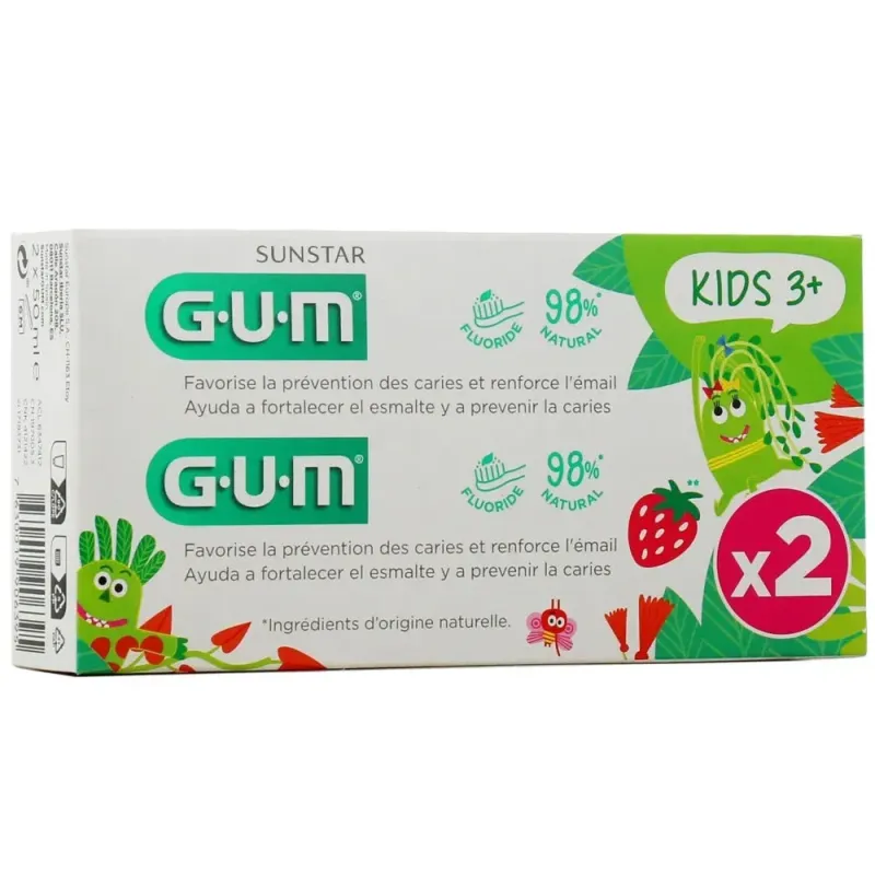Dentifrice GUM en pack duo au goût de fraise, conçu pour les enfants de 3 ans et plus. Protège efficacement les dents de lait contre les caries et renforce l'émail.
