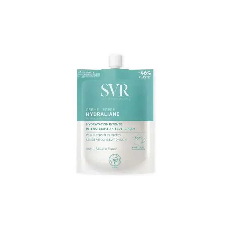 La crème légère HYDRALIANE de SVR est un soin hydratant intense conçu pour les peaux normales à mixtes. Sa formule, inspirée des soins médicaux, est enrichie en eau physio-adaptée et en sucre physiologique, qui reproduisent les mécanismes naturels d'hydratation de la peau pour lui apporter l'eau dont elle a besoin. Cette combinaison d'actifs assure une hydratation continue pendant 24 heures, apaisant les sensations de tiraillement et de sécheresse. Sa texture légère et fondante pénètre rapidement sans laisser de film gras, procurant une sensation de fraîcheur et de confort immédiate. Non comédogène et formulée avec 95% d'ingrédients d'origine naturelle, elle laisse la peau souple, douce et rebondie.