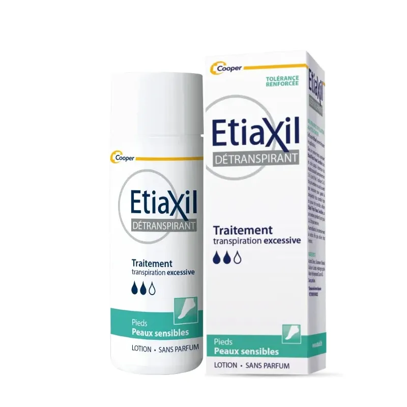 L'ETIAXIL DÉTRANSPIRANT LOTION PIEDS PEAUX SENSIBLES est un traitement intensif, présenté dans un flacon de 100 ml, spécifiquement conçu pour l'hyperhidrose sévère (transpiration très excessive) des pieds chez les personnes ayant une peau sensible ou réactive. Ce produit est une lotion détranspirante : son rôle est de bloquer efficacement et durablement la production de sueur au niveau des glandes sudoripares, assurant des pieds secs pendant plusieurs jours après une seule application. Sa formule est optimisée pour minimiser les risques d'irritation et de picotement couramment associés aux traitements intensifs, tout en maintenant une haute efficacité.