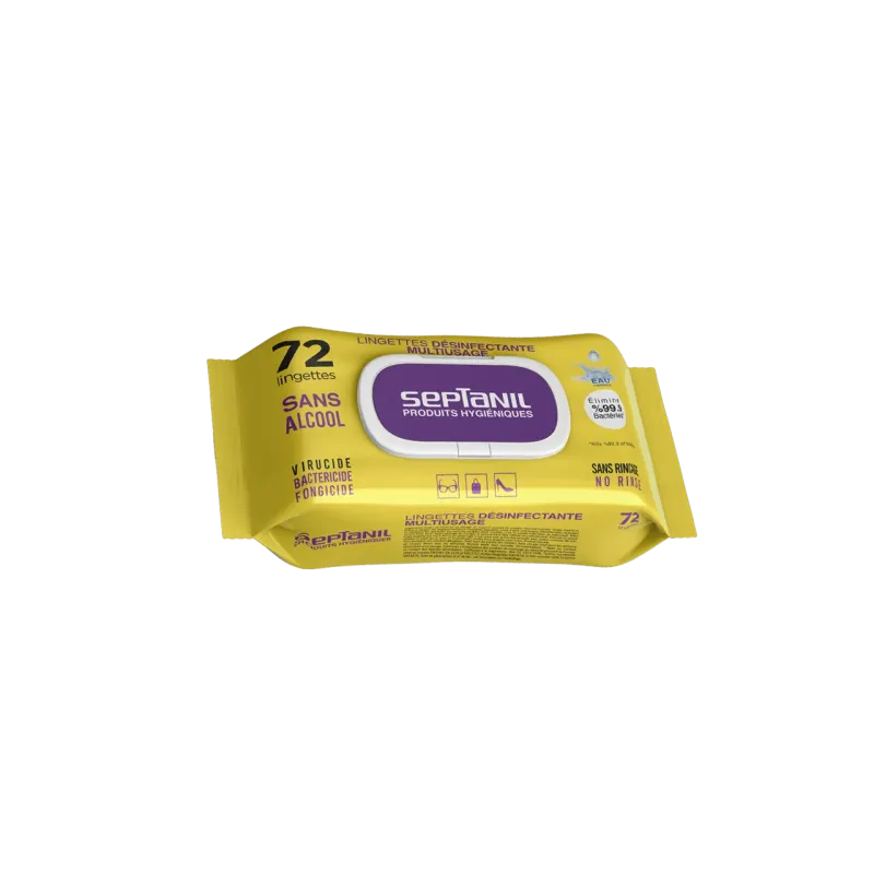 Les SEPTANIL LINGETTES DÉSINFECTANTES MULTI USAGE 72 PIÈCES sont une solution d'hygiène quotidienne pratique et rapide. Elles sont conçues pour désinfecter et nettoyer efficacement une multitude de surfaces et d'objets. Ces lingettes sont imprégnées d'une solution biocide (d'après les indications, une formule sans alcool mais à base de Chlorure de Benzalkonium est souvent utilisée pour les versions Multi-Usage et sans rinçage, ainsi qu'une version 70% Alcool pour les versions Médecin/Hydroalcooliques). Elles garantissent l'élimination de 99,9% des bactéries, virus et champignons. Leur format en boîte de 72 les rend idéales pour une utilisation nomade ou à la maison, permettant de maintenir une hygiène irréprochable sans nécessiter d'eau ni de savon. Elles sont testées sous contrôle dermatologique et sont souvent sans parfum ni colorant pour respecter les peaux les plus sensibles et les surfaces délicates.