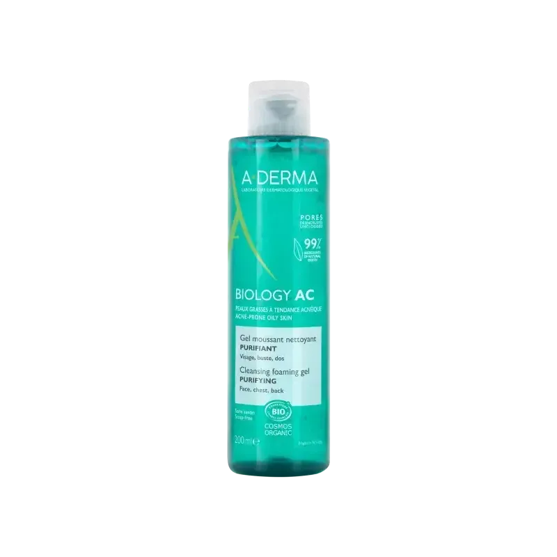A-DERMA BIOLOGY AC GEL MOUSSANT PURIFIANT 200ML est un soin d'hygiène dermatologique certifié BIO et spécifiquement formulé pour nettoyer en douceur les peaux grasses à tendance acnéique sans les dessécher. Grâce à sa composition à 99% d'ingrédients d'origine naturelle, sans savon et au pH physiologique, ce gel moussant respecte l'équilibre fragile de la peau et du microbiome cutané. Sa texture gel se transforme en une mousse onctueuse et facile à rincer, laissant la peau fraîche, nette et purifiée. Il agit efficacement pour désincruster les pores, éliminer les impuretés et l'excès de sébum responsables de la brillance et des éruptions cutanées, tout en apaisant la peau.