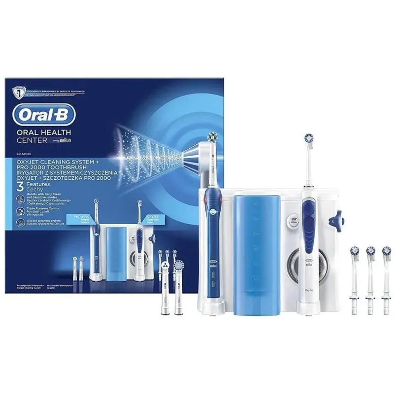 Centre de soins bucco-dentaires Oral-B OxyJet 3724, combinant une brosse à dents électrique haute performance et un hydropulseur à micro-bulles pour un nettoyage interdentaire et un soin des gencives de niveau professionnel.