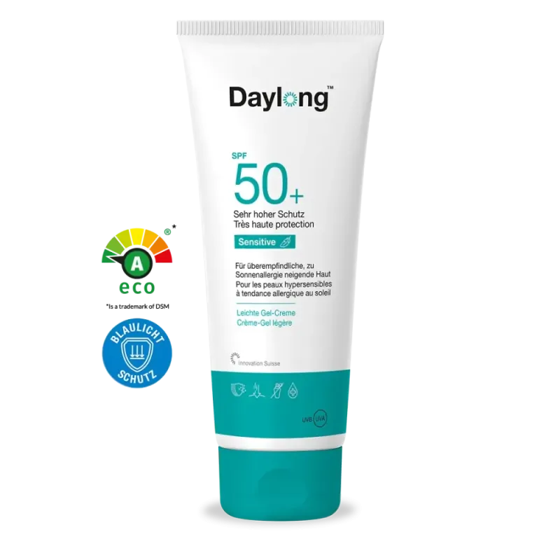 DAYLONG SENSITIVE GEL-CRÈME SPF 50+ 100ML est un soin solaire très haute protection spécialement formulé pour les peaux sensibles, intolérantes au soleil, et/ou à tendance grasse ou allergique (lucite estivale bénigne, acné de Majorque). Sa texture gel-crème légère et non grasse en fait un choix idéal pour le visage et le corps, offrant une protection efficace et un confort d'utilisation optimal.