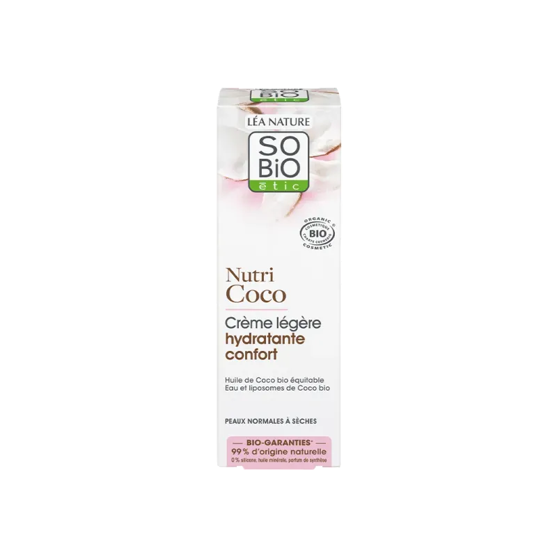 La Crème Légère Hydratante Confort de la gamme Nutri Coco de SO'BiO étic a été conçue pour réconcilier nutrition intense et légèreté. Sa texture aérienne et fondante pénètre rapidement sans laisser de film gras, la rendant idéale pour les peaux recherchant un soin nourrissant mais confortable. Formulée avec de l'Eau de Coco Bio et de l'Huile de Coco Bio équitable, cette crème offre une hydratation continue pendant 24 heures et nourrit la peau en profondeur. Elle est enrichie en Liposomes de Coco Bio pour une action ciblée. La peau est enveloppée d'un voile protecteur, retrouvant souplesse, douceur et confort au quotidien.