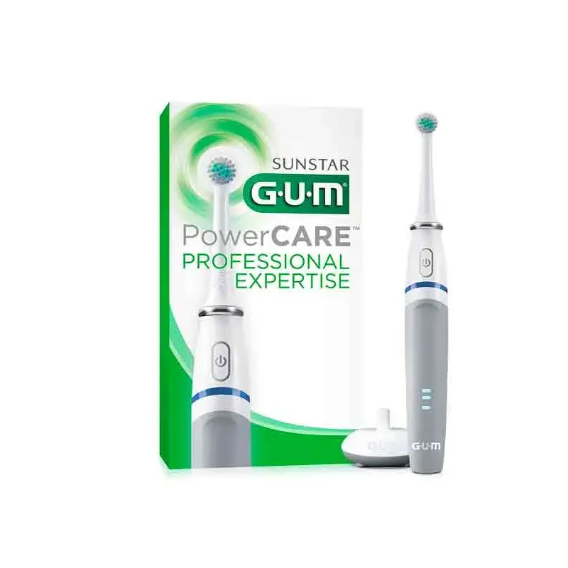 GUM POWERCARE BROSSE À DENTS ÉLECTRIQUE est une brosse à dents rechargeable conçue pour un contrôle intensif de la plaque dentaire tout en assurant une grande douceur pour les dents et les gencives. Elle utilise une technologie oscillo-rotative avec une tête de brosse remplaçable dotée de brins ultra-fins et effilés très doux qui nettoient en profondeur. Ces brins sont spécialement conçus pour atteindre efficacement les zones difficiles d'accès, le sillon gingival et les espaces interdentaires, favorisant ainsi une santé bucco-dentaire optimale. Elle est dotée de fonctionnalités intelligentes pour optimiser le brossage :