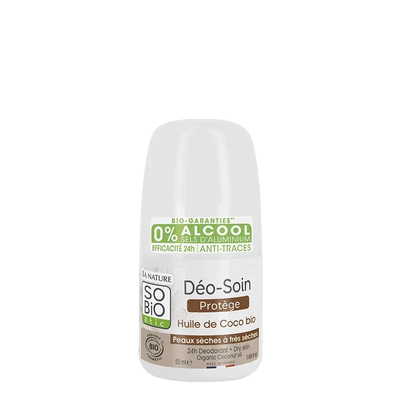 Déodorant roll-on certifié bio à l'huile de noix de coco, assurant une protection anti-odeurs naturelle sans sels d'aluminium.