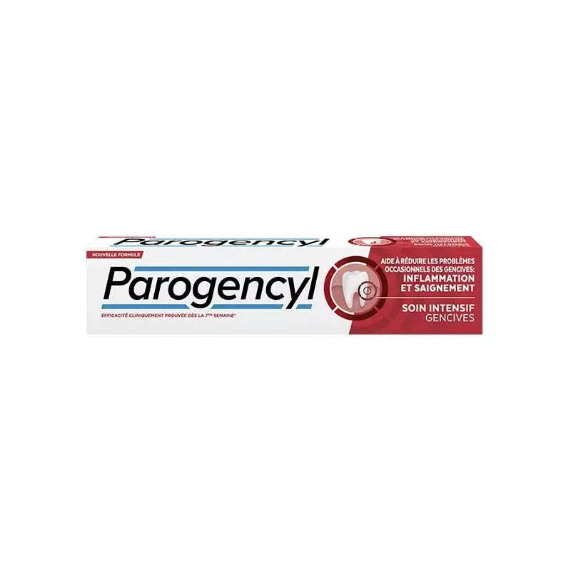 Le PAROGENCYL DENTIFRICE FORTE SOIN INTENSIF GENCIVES est une pâte dentifrice, présentée en tube de 75 ml, spécialement formulée pour les personnes souffrant de problèmes de gencives sévères ou de gingivite et parodontite installées. Ce dentifrice est un soin d'attaque ou de soutien intensif, caractérisé par une concentration élevée en actifs pour une action rapide et efficace. Il vise à réduire significativement l'inflammation, le saignement et la douleur gingivale. Les ingrédients clés sont souvent des agents antibactériens et anti-inflammatoires puissants (comme la Chlorhexidine ou le Perméthol, selon la formule), pour un traitement local intensif de la cause bactérienne de l'affection.
