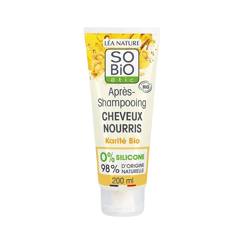 Après-shampoing biologique au Karité et Céramides d’Argan, il démêle et nourrit intensément les cheveux secs à très secs, leur redonnant souplesse et brillance.