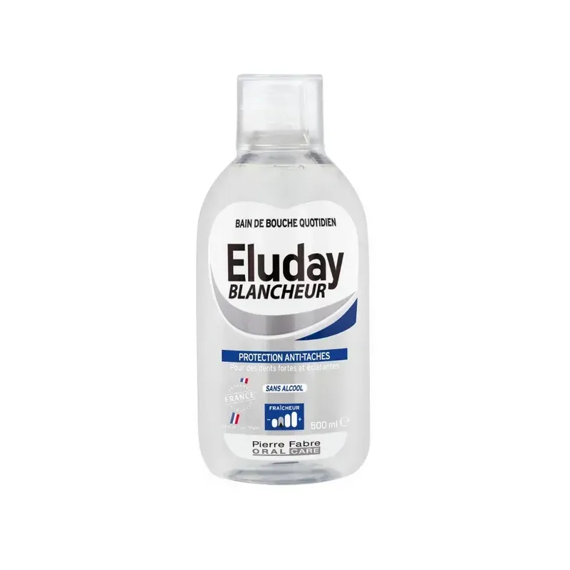 ELUDAY BLANCHEUR BAIN DE BOUCHE QUOTIDIEN est une solution d'hygiène buccodentaire, présentée en flacon de 500 ml, spécialement conçue pour être utilisée en complément du brossage. Il vise principalement à maintenir et prolonger la blancheur naturelle des dents et à prévenir l'apparition des taches tout en assurant une protection globale. Sa formule agit en douceur sur la surface de l'émail pour éliminer les résidus qui peuvent ternir le sourire, sans agresser ni l'émail ni les gencives. Il est généralement formulé sans alcool et intègre du fluor pour une protection anti-carie.