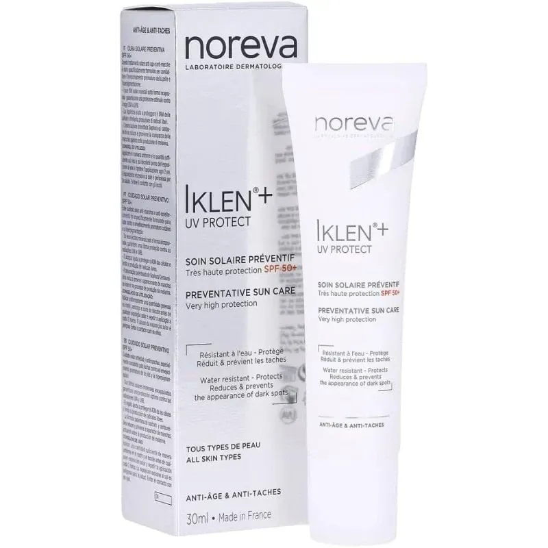 Le NOREVA IKLEN+ UV PROTECT SPF 50 30ML est un soin solaire préventif de très haute protection spécifiquement élaboré pour les peaux sujettes aux taches de pigmentation (mélasma, lentigo, hyperpigmentation post-inflammatoire). Ce produit offre une double action : une protection efficace contre les rayons UV nocifs (SPF 50+) pour prévenir l'apparition de nouvelles taches, et une action correctrice et préventive sur la mélanine pour réduire l'intensité des taches existantes et unifier le teint. Grâce à une combinaison d'actifs brevetée et innovante, il agit directement sur les mécanismes de la pigmentation pour un teint plus homogène et lumineux. Il est souvent recommandé pour une protection quotidienne et après des interventions esthétiques non invasives (peelings, lasers).