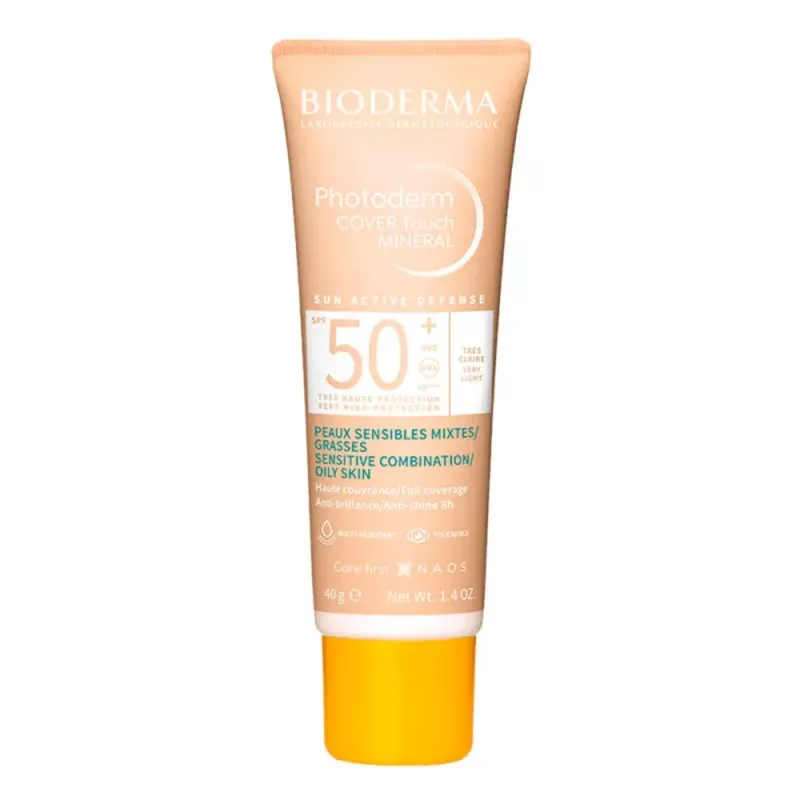 BIODERMA PHOTODERM COVER TOUCH MINERAL TRÈS CLAIRE SPF50+ 40G est une crème solaire teintée, très haute protection, formulée spécifiquement pour les peaux mixtes à grasses, même sensibles ou intolérantes aux filtres chimiques. Elle combine une protection solaire 100% minérale avec une action couvrante et matifiante pour un teint unifié et sans brillance, tout en laissant respirer la peau. La teinte "Très Claire" est adaptée aux carnations les plus claires.