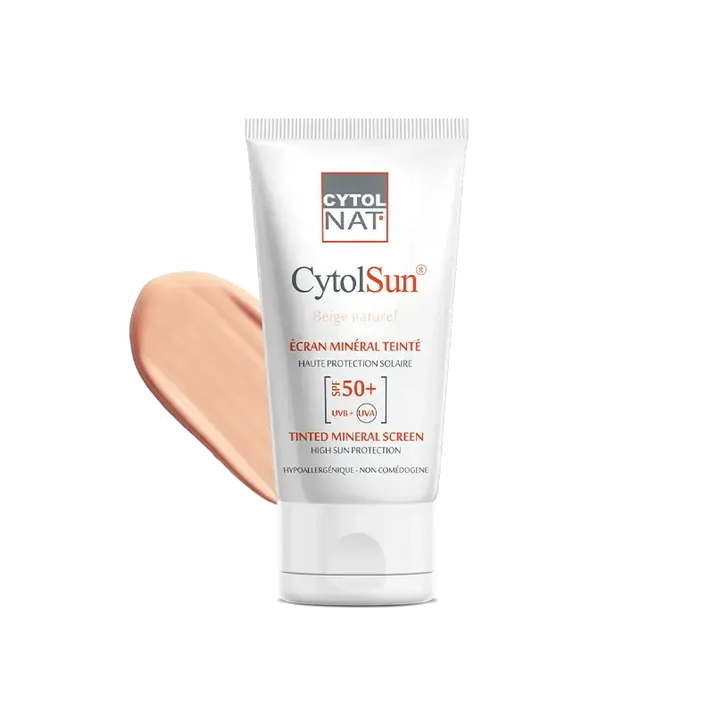 L'Écran Solaire CYTOLSUN Teinté SPF50+ de Cytolnat est un soin quotidien qui offre une très haute protection solaire tout en sublimant le teint. Dans la nuance Beige Naturel, cette crème allie une défense maximale contre les rayons UVA et UVB à l'effet perfecteur d'un fond de teint léger. Sa formule enrichie en actifs hydratants et antioxydants protège la peau du photovieillissement, des taches solaires et des coups de soleil, tout en masquant les petites imperfections pour un teint unifié, lumineux et naturellement éclatant. Sa texture fondante et non grasse assure un confort optimal et un fini impeccable qui dure toute la journée.