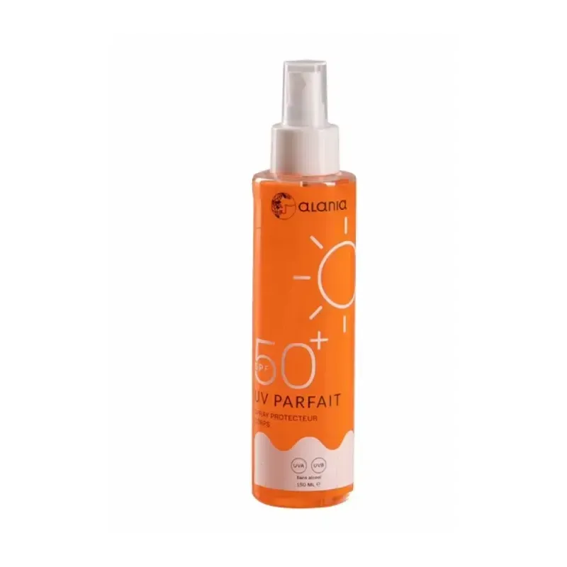 ALANIA UV PARFAIT Spray Protecteur Corps SPF50+ 150ML est une protection solaire corporelle à large spectre (UVA/UVB) sous forme de spray. Grâce à une technologie de filtres solaires performante, il assure une très haute protection contre les rayons du soleil, aidant ainsi à prévenir les coups de soleil et le photo-vieillissement cutané prématuré. Sa texture unique, à la fois sèche et légèrement huileuse, pénètre immédiatement sans laisser de fini gras ni collant sur la peau. En plus de protéger, ce soin hydrate la peau et aide à sublimer le bronzage. Le format spray facilite grandement l'application sur toutes les zones du corps.
