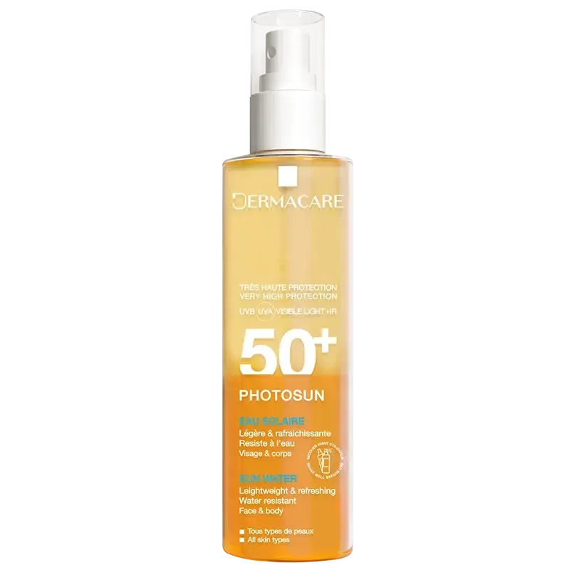 La Dermacare Photosun Eau Solaire SPF50+ est conçue pour offrir une très haute protection contre les rayons UVA et UVB, responsables des coups de soleil, du vieillissement cutané prématuré et des dommages cellulaires. Elle est idéale pour les personnes qui n'apprécient pas les textures épaisses des écrans solaires classiques et qui recherchent une protection efficace et agréable à porter, même sous forte chaleur.