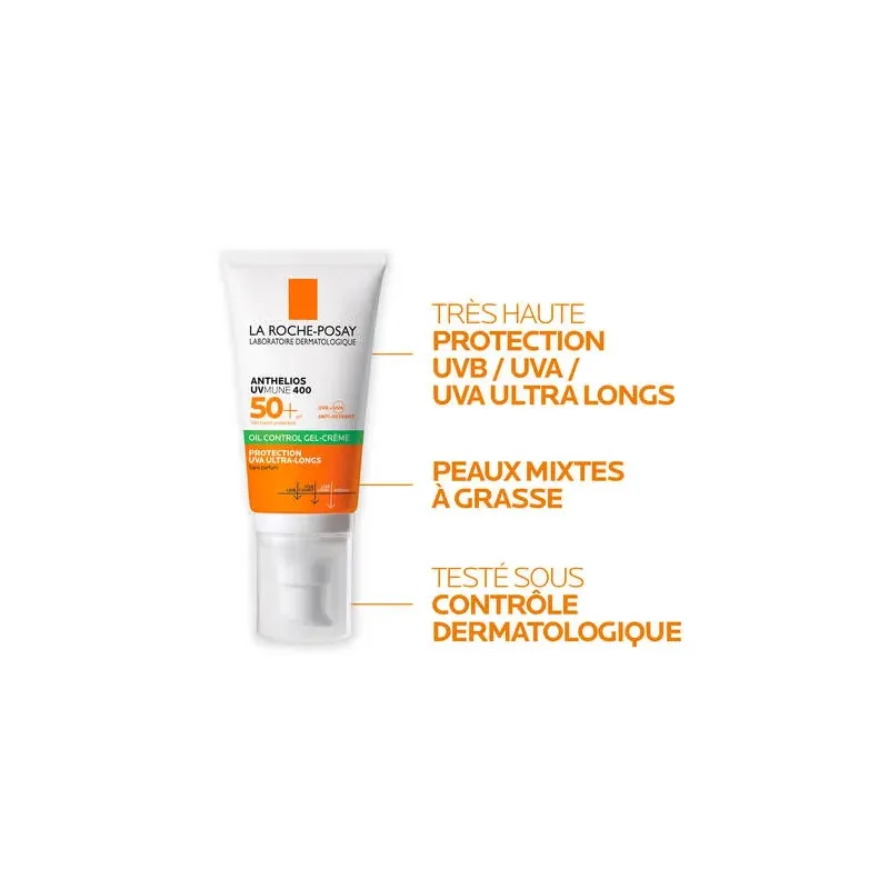 La Roche-Posay Anthelios UVMune 400 Oil Control Gel Crème Invisible SPF50+ (50 ml) est une protection solaire visage ultra-haute, spécifiquement formulée pour les peaux grasses à très grasses, y compris les peaux sensibles et à tendance acnéique. Ce gel-crème innovant combine la protection la plus complète contre les UV les plus insidieux avec un contrôle de la brillance très efficace, pour un fini sec et invisible.
