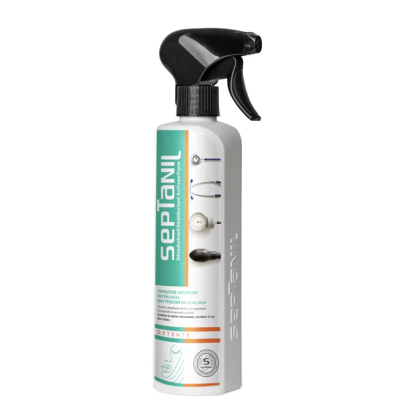 Le SEPTANIL DÉSODORISANT DÉSINFECTANT ANTISEPTIQUE DÉTENTE 500ML est une solution en spray triple action conçue pour le nettoyage, la désinfection et la désodorisation des surfaces, des équipements et de l'atmosphère. Ce produit combine une efficacité biocide, visant à éliminer les micro-organismes tels que les bactéries, les virus et les protozoaires (avec des normes souvent vérifiées comme Bactéricide EN 1276 et Fongicide NF/EN 13624), avec un parfum spécifiquement axé sur le bien-être. Sa senteur Détente se caractérise par des notes douces de thé vert et de verveine, procurant une sensation de relaxation et de bien-être dans les espaces traités. Le produit permet de réaliser le nettoyage et l'assainissement en une seule étape et laisse une odeur fraîche et légère qui dure longtemps.