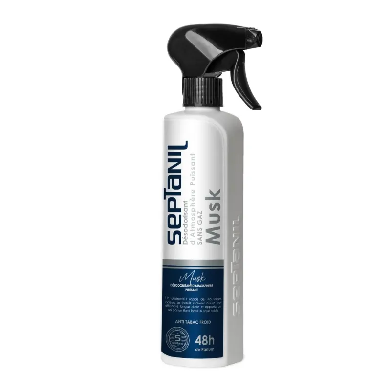 Le SEPTANIL DÉSODORISANT D'ATMOSPHÈRE PUISSANT MUSK 500ML est une solution désodorisante et assainissante conçue pour neutraliser efficacement les odeurs tenaces tout en parfumant durablement l'environnement. Ce désodorisant se caractérise par son parfum de Musk (Musc), une senteur classique, propre, fraîche et légèrement poudrée, procurant une irrésistible sensation de fraîcheur et de pureté. Présenté en flacon spray de 500 ml, il possède une formule puissante qui agit comme un destructeur rapide des mauvaises odeurs (y compris anti-tabac froid et anti-vapeur). Il est formulé sans gaz propulseur (non-aérosol), ce qui le rend à la fois biodégradable et écologique, idéal pour une utilisation quotidienne et prolongée dans divers espaces.