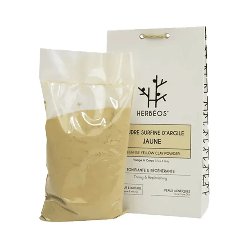 L'Argile Jaune Surfine d'HERBÉOS est une poudre minérale naturelle d'origine terrestre, extraite d'une carrière, puis séchée et broyée sans aucun traitement chimique. Sa couleur jaune est due à sa richesse en minéraux et en oligo-éléments, notamment en illite. Elle est particulièrement réputée pour ses propriétés tonifiantes et régénérantes. Utilisée en masque, elle absorbe les impuretés, les toxines et l'excès de sébum tout en douceur, sans agresser l'épiderme. Sa finesse ("surfine") la rend facile à mélanger et agréable à appliquer, offrant un soin purifiant et adoucissant.