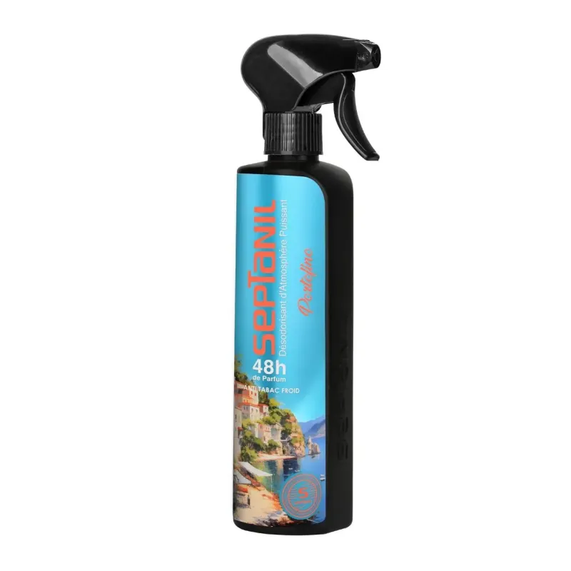 Désodorisant d'atmosphère puissant de 500ml, il neutralise les odeurs tenaces (anti-tabac froid) et diffuse une élégante brise méditerranéenne Portofino de longue durée, le tout sans gaz.