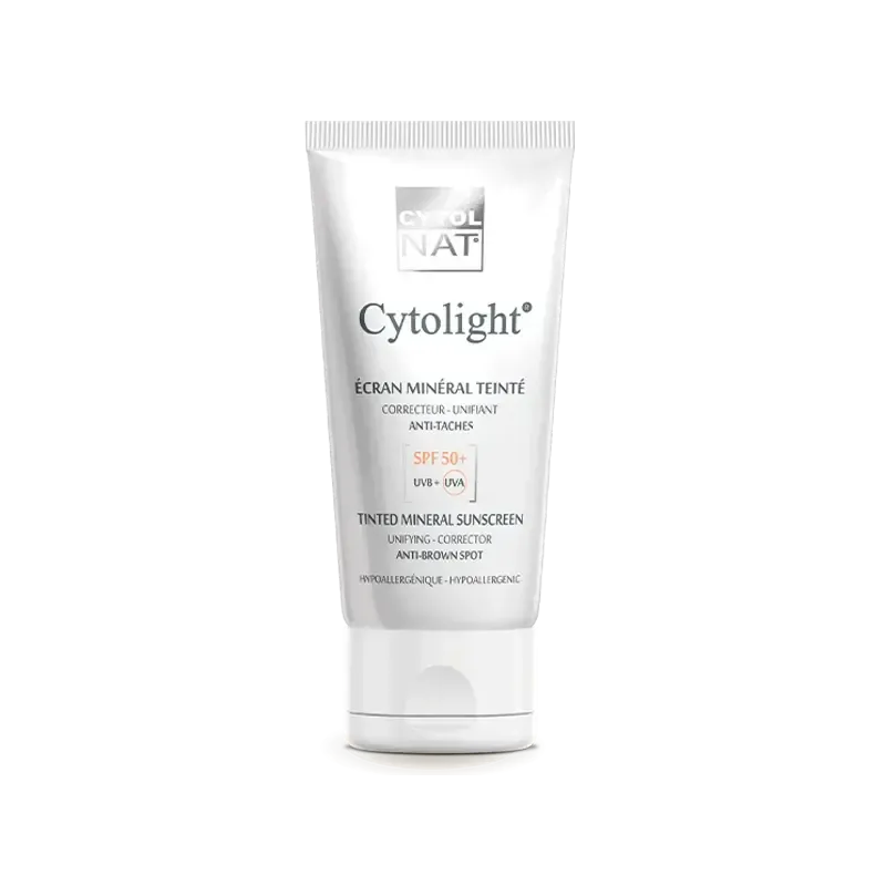 L'Écran Minéral Teinté Anti-Taches SPF50+ CYTOLIGHT de Cytolnat est un soin quotidien à double action qui protège la peau des rayons solaires tout en corrigeant et prévenant l'apparition des taches pigmentaires. Sa formule est basée sur des filtres 100% minéraux, offrant une très haute tolérance aux peaux les plus sensibles et réactives. Sa teinte légère camoufle les imperfections et unifie le teint pour un effet "bonne mine" immédiat. Il offre une protection optimale contre les UVA et les UVB, tout en agissant sur les taches existantes pour un teint plus lumineux et uniforme.