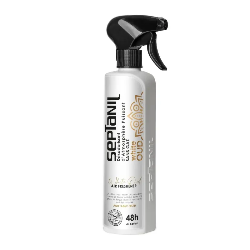 Le SEPTANIL DÉSODORISANT D'ATMOSPHÈRE PUISSANT OUD WHITE 500ML est un spray non-aérosol conçu pour purifier l'air et neutraliser les mauvaises odeurs tout en enveloppant l'espace d'une fragrance luxueuse. Le parfum "Oud White" est une variation plus légère, plus douce et plus rayonnante du classique Oud (bois d'agar), ce qui le rend oriental et sophistiqué sans être trop lourd. Il est souvent décrit comme un symbole de la beauté à l'orientale, apportant une aura luxueuse et fascinante. Ce produit possède une formule puissante qui agit comme un destructeur d'odeurs immédiat (anti-tabac froid, anti-vapeur), garantissant une efficacité olfactive longue durée pour une atmosphère pureté intense et haut de gamme.