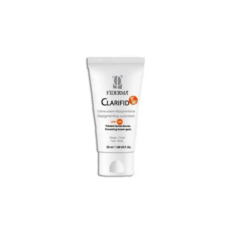 FIDERMA CLARIFID CREME Dépigmentante SOLAIRE SPF 50+ est un photoprotecteur ciblé pour hyperpigmentations de la peau. Sa formule assure une très haute protection contre les rayons UVA et UVB. réduit et prévient les taches pigmentaires et vieillissement de la peau.