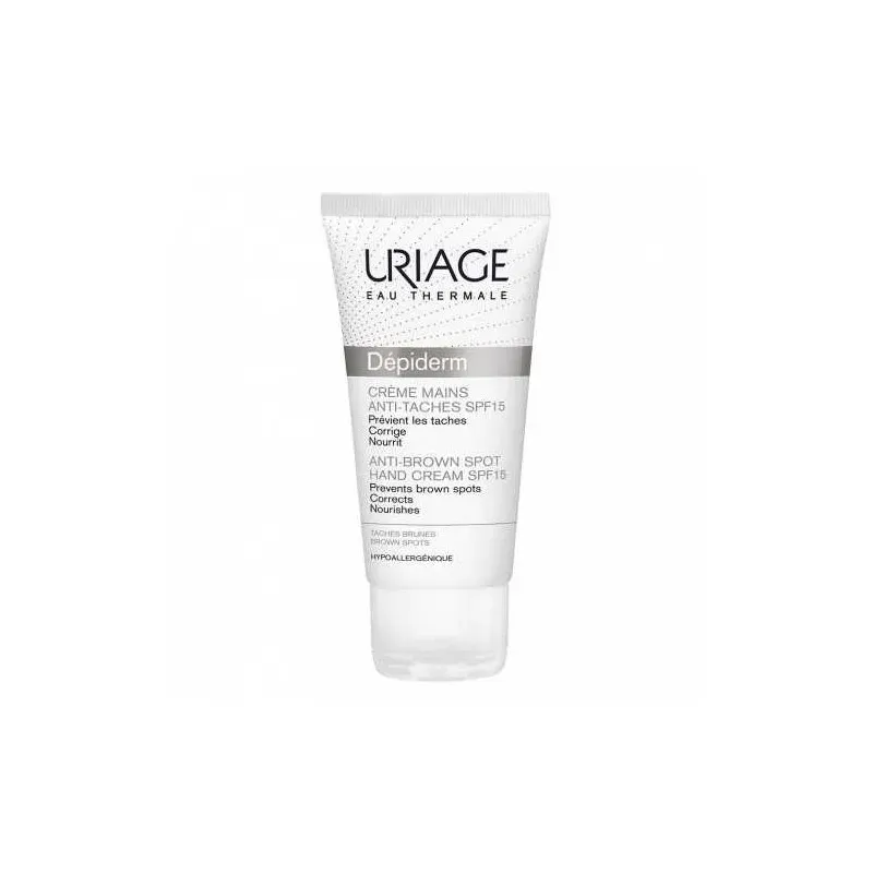 URIAGE Dépiderm Crème Mains Anti-Taches Brunes SPF15 50ml est un soin ciblé pour les mains, spécifiquement développé pour corriger les taches brunes existantes et prévenir leur apparition, tout en apportant une hydratation et une protection quotidiennes.