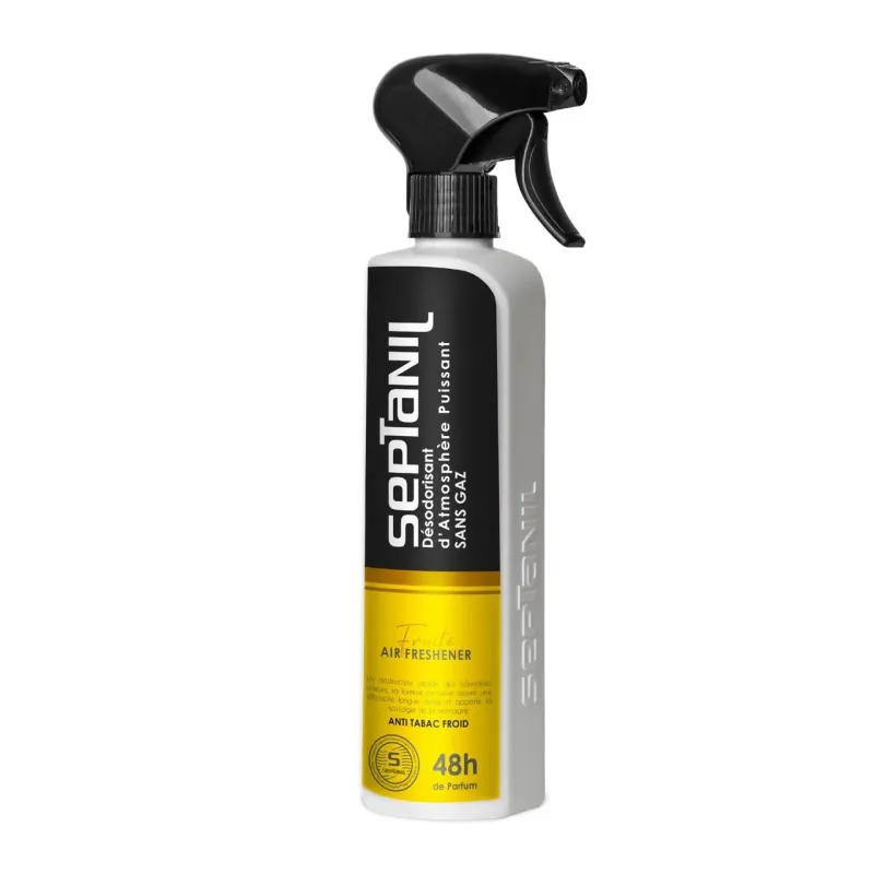 Le SEPTANIL DÉSODORISANT D'ATMOSPHÈRE PUISSANT FRUIT JUTEUX 500ML est une brume d'ambiance concentrée et efficace, conditionnée dans un flacon pulvérisateur sans gaz propulseur. Il est conçu pour être un destructeur rapide des mauvaises odeurs (y compris le tabac froid), tout en laissant derrière lui une fragrance vibrante de Fruit Juteux. Cette senteur est souvent associée à une ambiance fruitée, fraîche, joyeuse et gourmande, rappelant l'été et la vitalité. Sa formule exclusive garantit une efficacité longue durée, le parfum pouvant persister durablement dans l'air et sur les textiles. Ce désodorisant transforme instantanément l'atmosphère en un lieu plus accueillant et énergique, idéal pour neutraliser les odeurs tenaces.