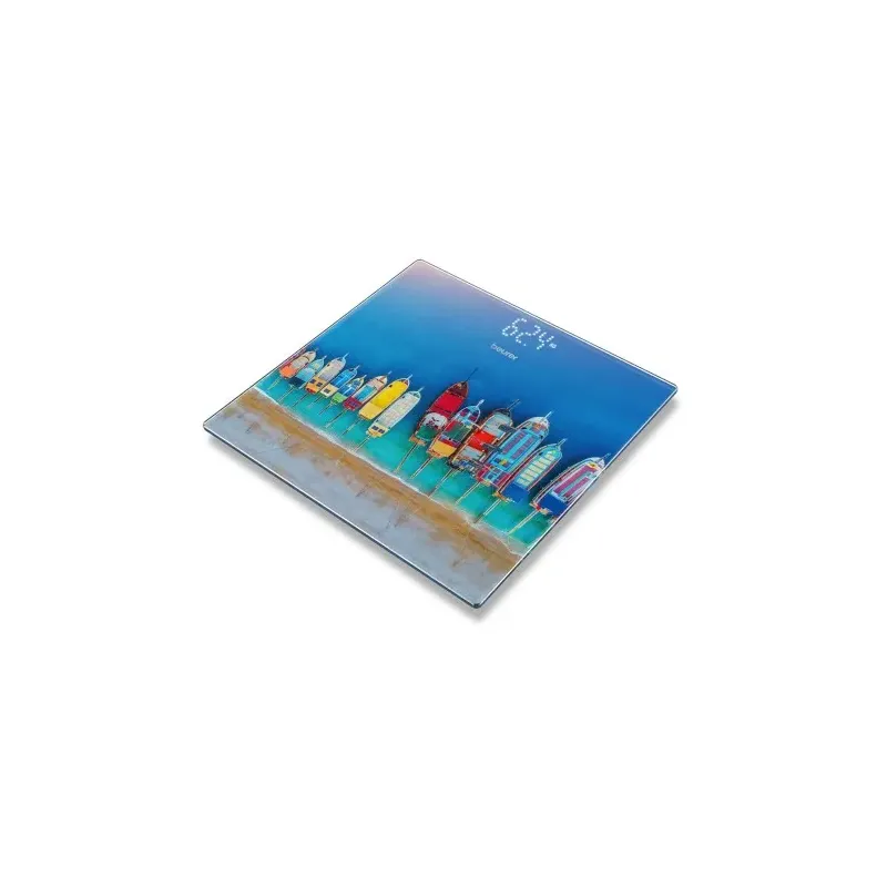 Pèse-personne impédancemètre Beurer BF 183 en verre de sécurité, qui mesure le poids, le taux de graisse, d'eau, de muscle et la masse osseuse, ainsi que l'IMC. Il est doté d'un écran rétro-éclairé et mémorise 10 profils d'utilisateurs.