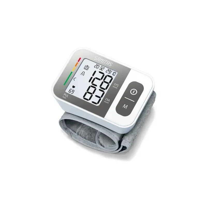 Le Sanitas Tensiomètre à Poignet SBC15 est un appareil d'automesure complet et portable, offrant une mesure entièrement automatique, une capacité de mémoire pour deux utilisateurs (2 x 60), le calcul des moyennes sur 7 jours et une détection des arythmies.
