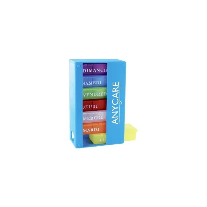Ce pilulier hebdomadaire Anycare doté de 3 cases par jour pour 7 jours est un outil essentiel pour le suivi précis et sécurisé d'un traitement médicamenteux sur une semaine, garantissant une meilleure observance.